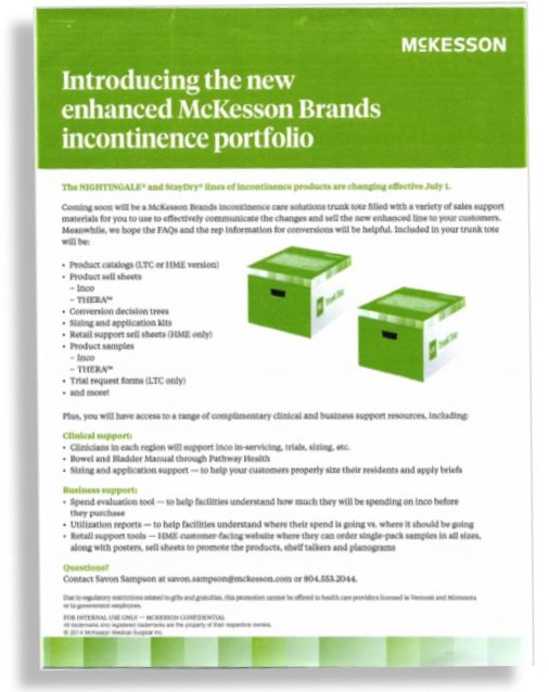 …Joan showed me the EC Trunk Tote for launching MCK Brand Inco with the EC reps and I was very impressed. It is a really neat and well thought out promotional product pack. If I were a rep, I would love that material and the clear investment that went into it. It would give me confidence and energy to go out and start talking about MCK Brand Inco right away and that is great. Good work you guys.