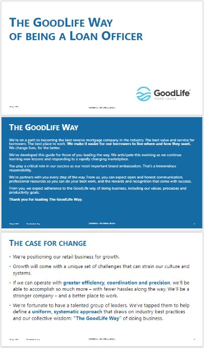 Managed “The GoodLife Way” roll out for the executive leadership team with the goal of delivering an outstanding borrower experience